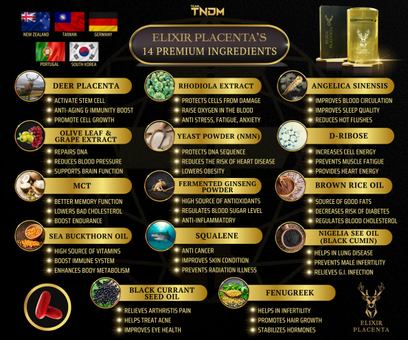 Elixir Placenta is a supplement that combines stem cell therapy, DNA therapy, and anti-inflammatory therapy in one soft gel capsule, primarily made from New Zealand deer placenta.